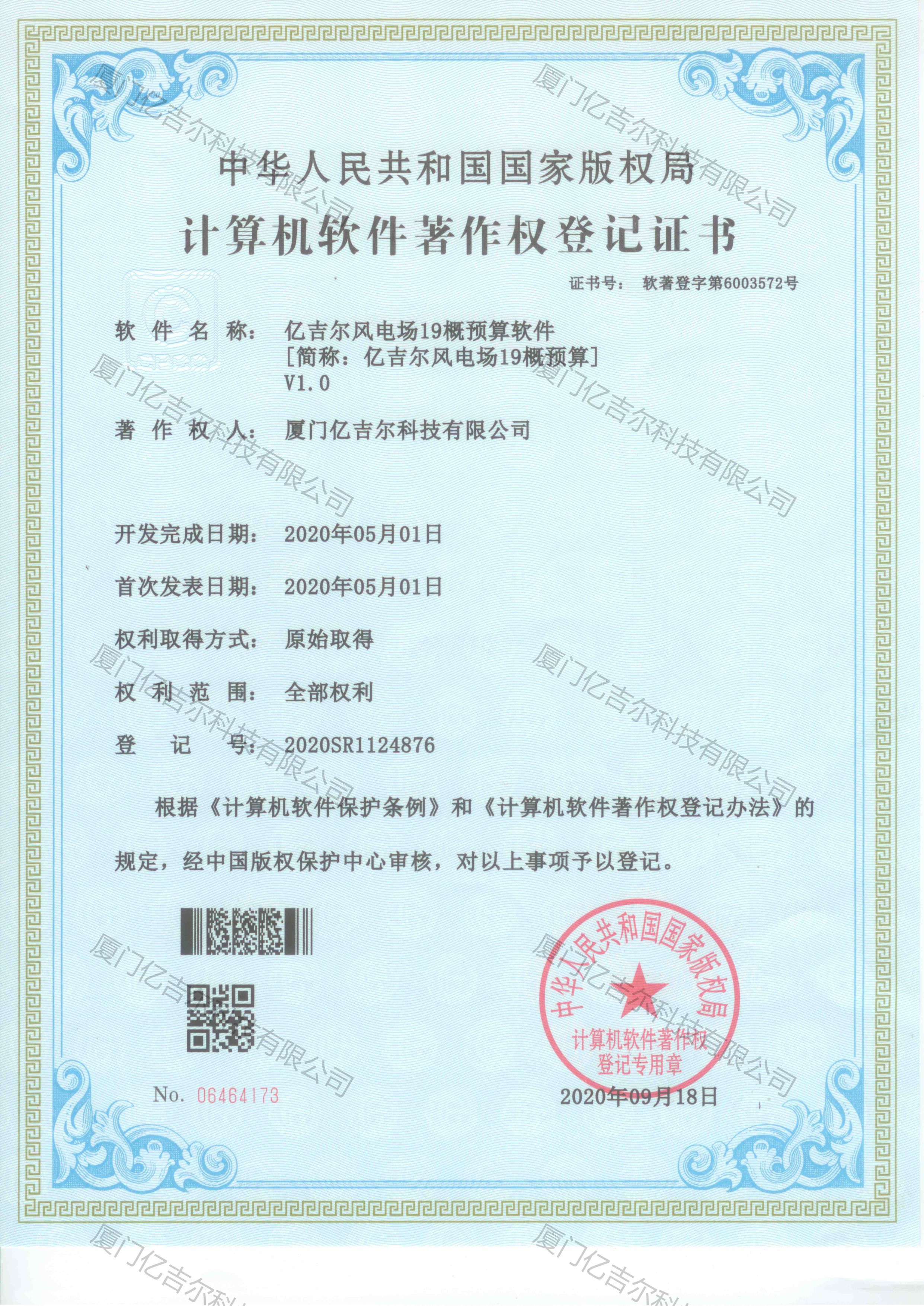 億吉爾風(fēng)電場19概預(yù)算軟件著作權(quán)登記證書 發(fā)布日期:2020年09月18日 瀏覽次數(shù):4737 關(guān)鍵字: 公司 1/1億吉爾風(fēng)電場19概預(yù)算軟件著作權(quán)登記證書