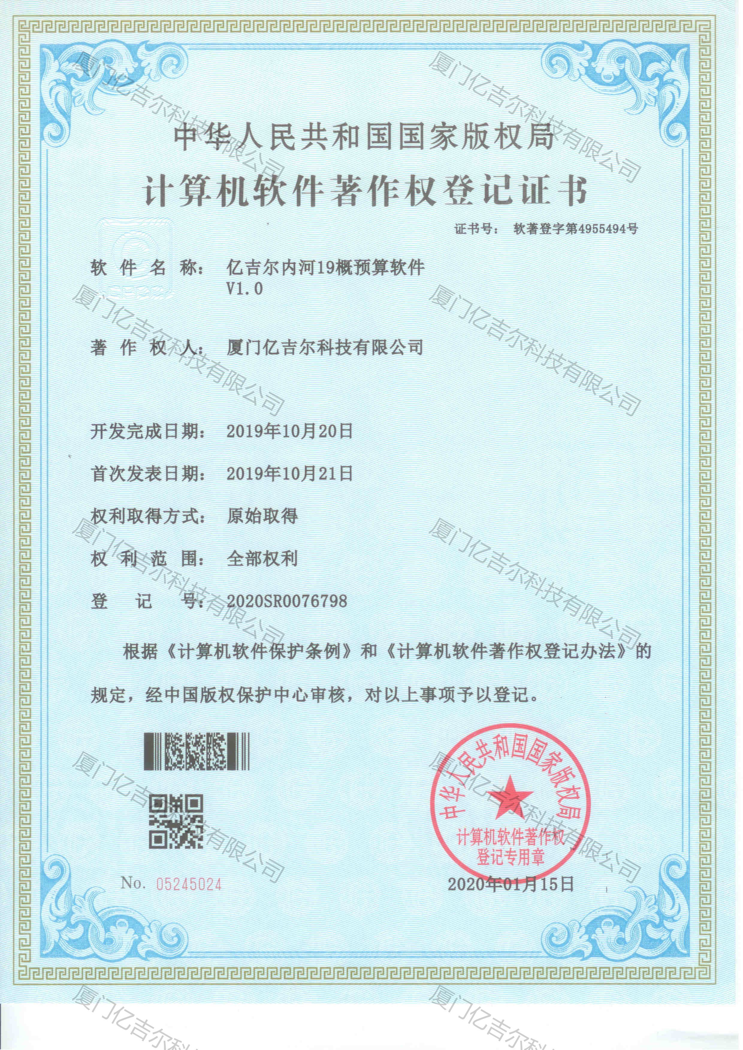億吉爾內(nèi)河19概預(yù)算軟件著作權(quán)登記證書 發(fā)布日期:2020年01月15日 瀏覽次數(shù):4946 關(guān)鍵字: 公司 1/1億吉爾內(nèi)河19概預(yù)算軟件著作權(quán)登記證書