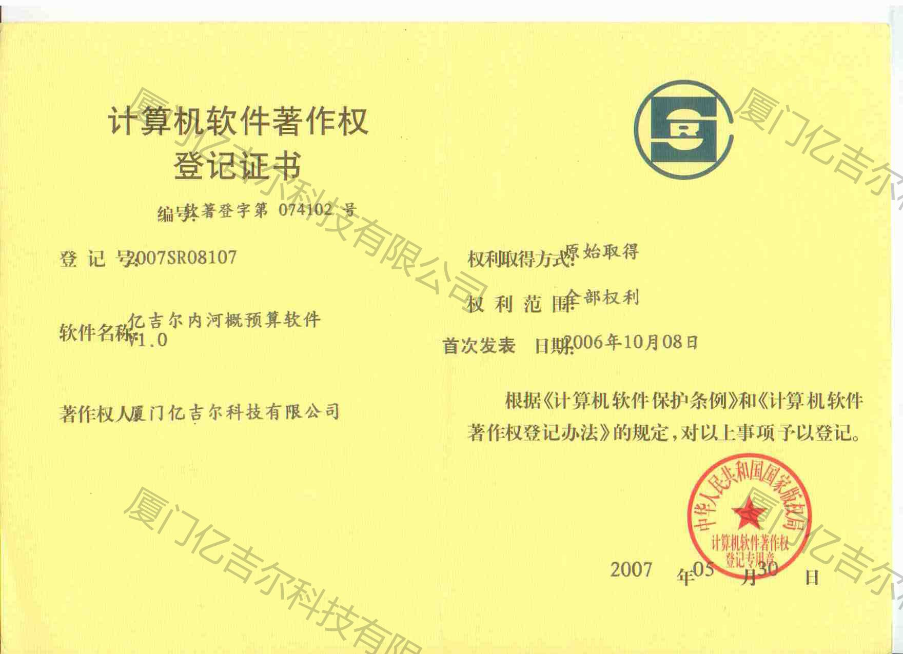 億吉爾內(nèi)河概預(yù)算軟件著作權(quán)登記證書 發(fā)布日期:2007年05月30日 瀏覽次數(shù):4167 關(guān)鍵字: 公司 1/1億吉爾內(nèi)河概預(yù)算軟件著作權(quán)登記證書
