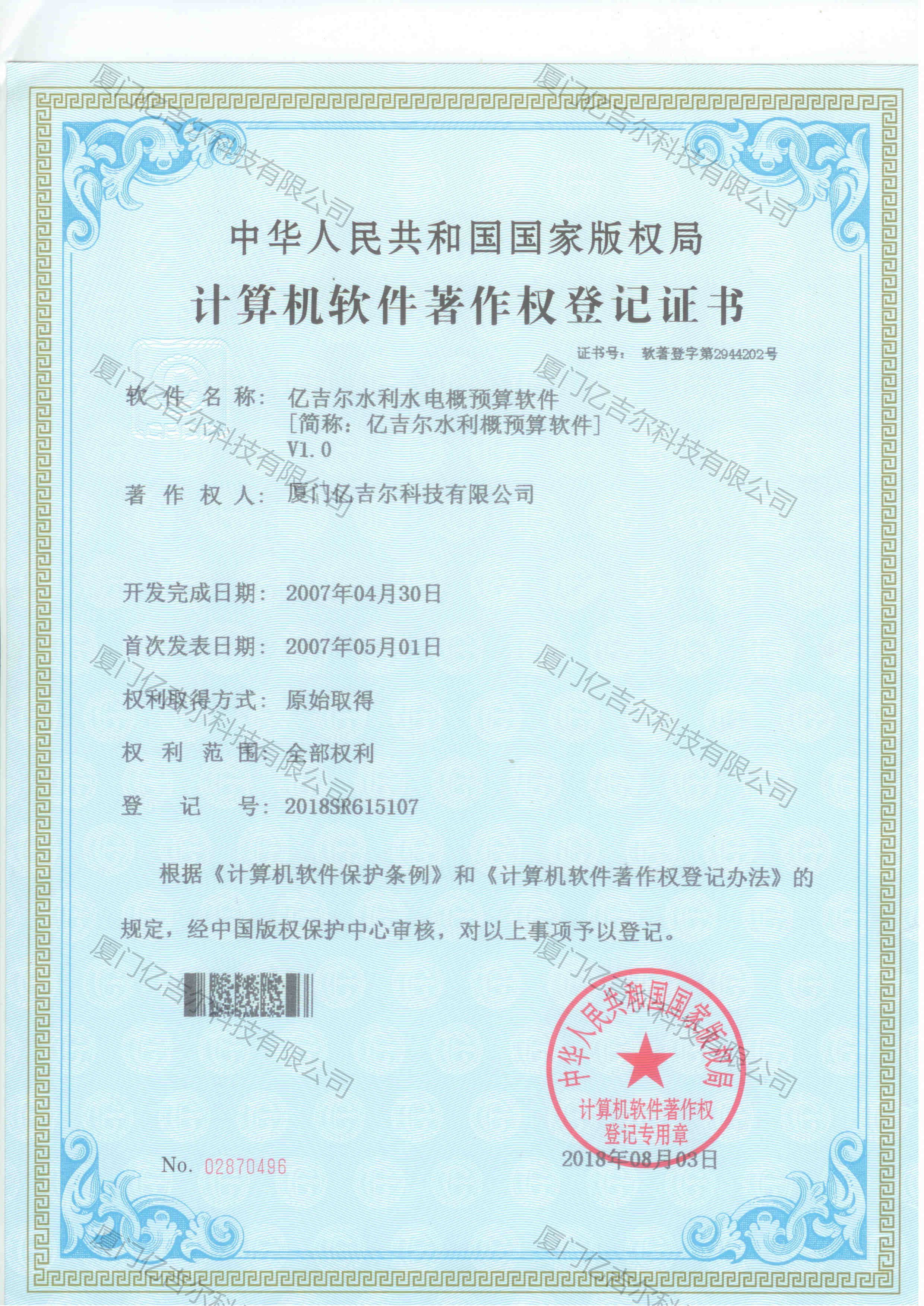 億吉爾水利水電概預(yù)算軟件著作權(quán)登記證書(shū) 發(fā)布日期:2018年08月03日 瀏覽次數(shù):4267 關(guān)鍵字: 公司 1/1億吉爾水利水電概預(yù)算軟件著作權(quán)登記證書(shū)